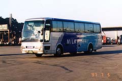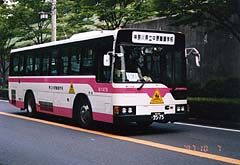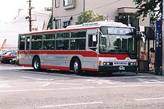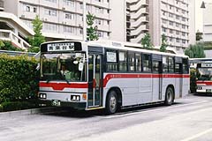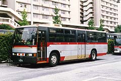 ワンロマ車といわれる、路線、貸切の兼用車です。路線車の塗装をベースに貸切車のカラーである金色のライン(現在の貸切車は塗装変更により金色は使っていません)があしらわれています。ワンロマ車と呼ばれる車は各社に結構あるようで、普通の路線車のボディにリクライニングシートを装備したものから、東急のように専用ボディ(?)のものまで各種あるようです。この車両は導入当初は一般路線、貸切、送迎、深夜急行(渋谷−青葉台)にと活躍していましたが、現在ではその定員(特に立席定員)の少なさからラッシュに対応できず、一般路線の運用から外れ深夜急行専用車としてほそぼそと余生を送っています(^^)。4列のリクライニングシート装備で座れさえすれば、いい車だったんですけどねえ。これも今後の代替が気になります。