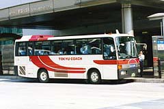 東急の夜行高速用の車両です。東急の高速バスは現在は渋谷から姫路、和歌山、出雲の3路線です(あと酒田行きもありましたが現在は庄内交通の単独運行になっています)。「ミルキーウェイ」という愛称がついていますが、これは「東急の高速バス」全体の愛称で路線ごとの愛称はなく、その上共同運行の相手会社も独自の愛称をつけたり、路線路線別の愛称を持ってたりばらばらでかなりわかりにくくて定着していません。さて、この高速車のカラーリングですが、愛称の「ミルキーウェイ」にちなんだ(?)星空をイメージさせる銀色に紺、空色の3色ですが、この塗装は明るいところで見るにはいいですが、夜行バスとして考えると、もうちょっと白とか赤とか夜でも一目でわかるデザインのほうがいい気がします。(そういえば運行開始当初は忠犬ハチ公がマスコット(?)でテレホンカードとかぬいぐるみとか売っていましたが、いつのまにかなくなっちゃいましたねぇ。いっそのこと、バスの塗装もハチ公の絵とかでっかく描いたデザインにすれば結構ウケそうな気がしますが・・・)